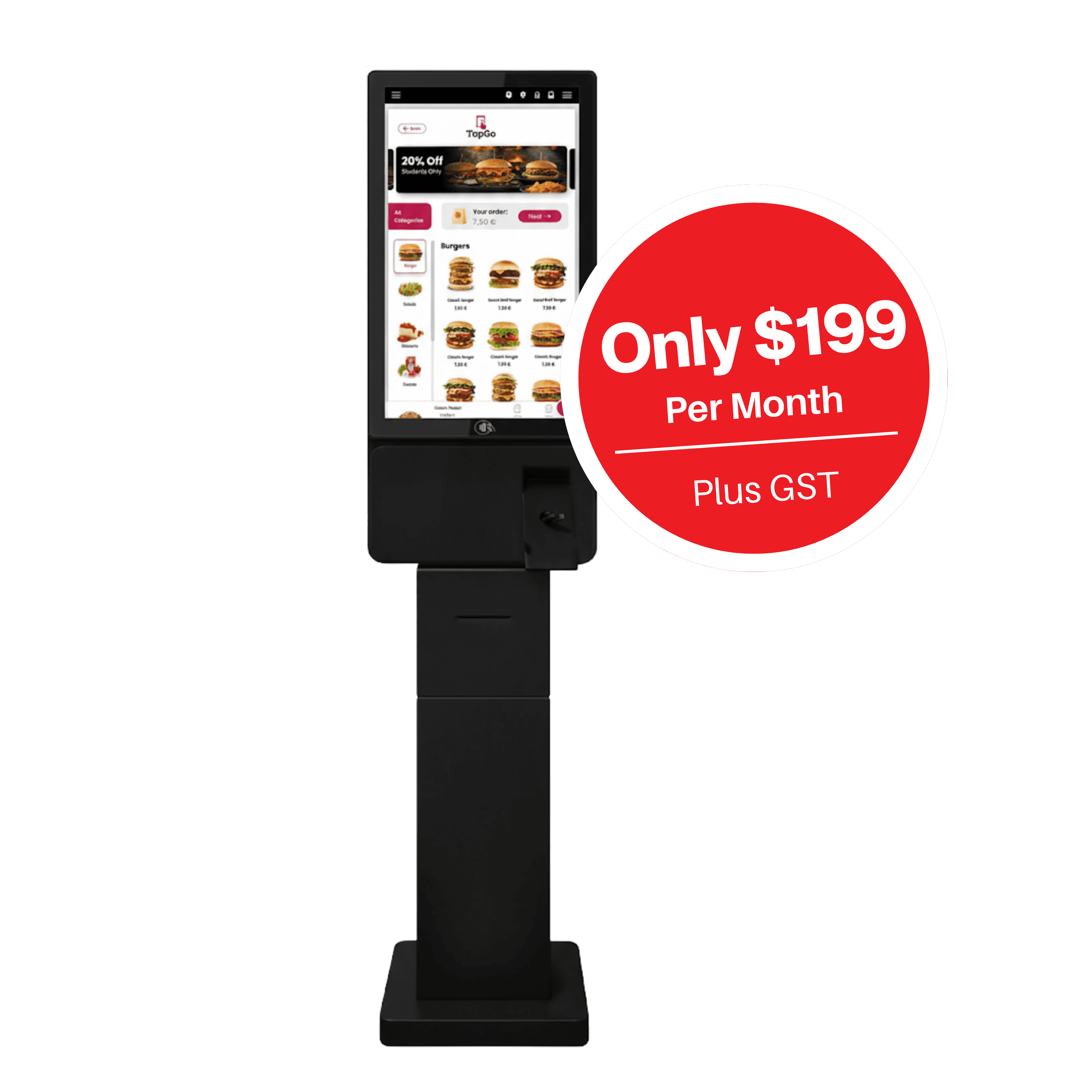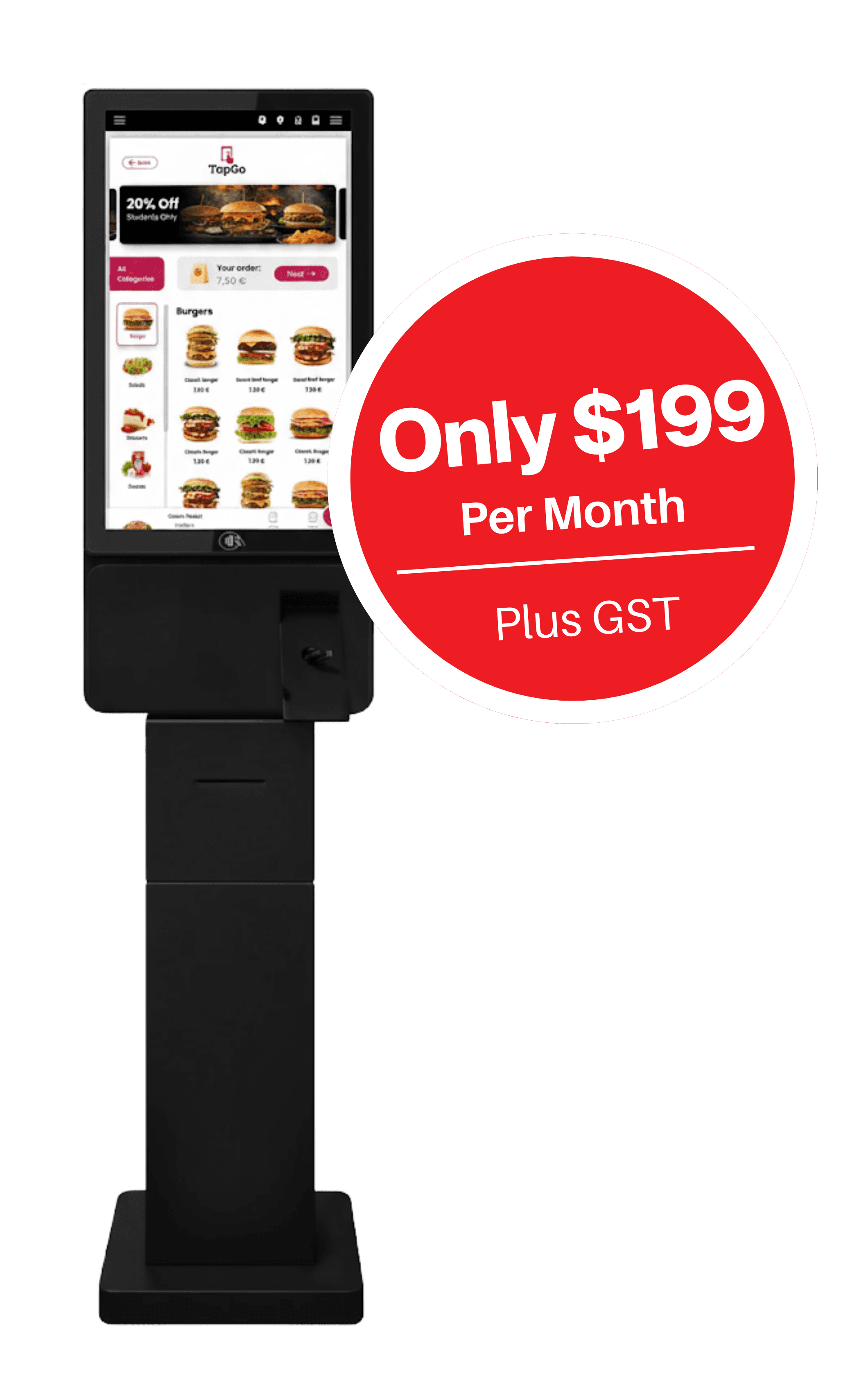 TapGo is an all-in-one solution for digitising restaurants. We provide self-ordering kiosks, QR code ordering, mobile payments, and ultra-simple software — all with a one-time setup fee of $299 + GST and a $199/month + GST subscription.